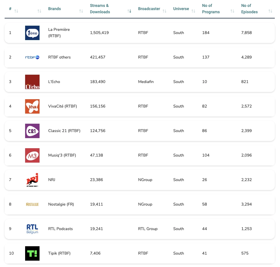 Au niveau des marques les plus écoutées au niveau de leurs podcasts et émissions en replay, le classement est largement dominé par la RTBF avec sur le podium :