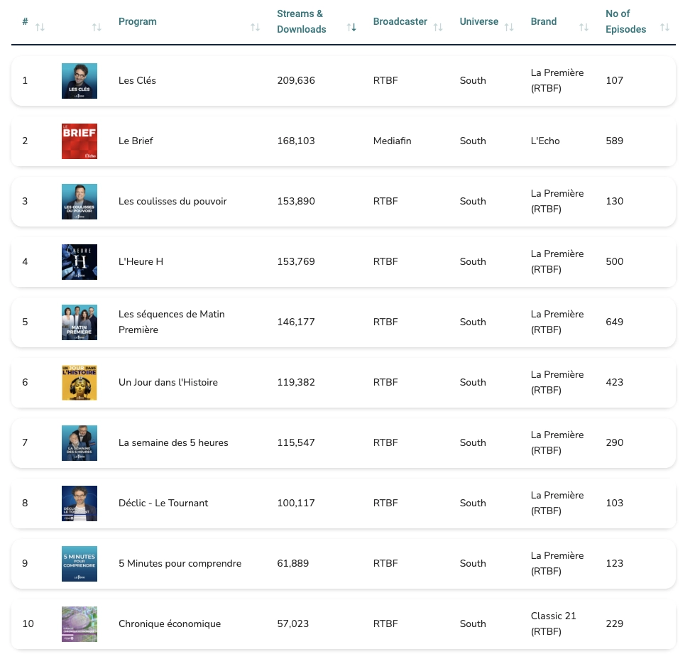 • L’Echo, de Mediafin, avec 190.442 streams, répartis sur 10 programmes et 1.075 épisodes.