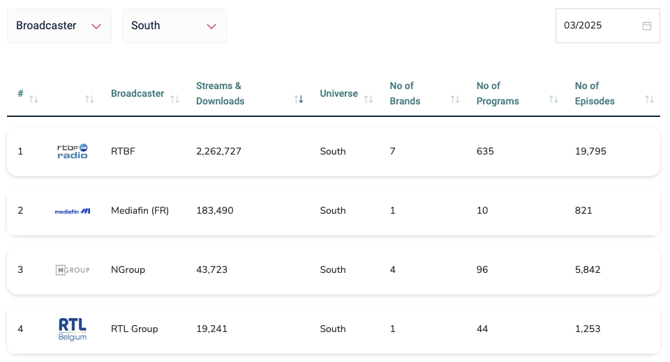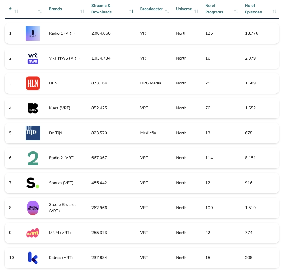 • Radio 1 (VRT), avec 1.922.898 streams, répartis sur 124 programmes et 14.632 épisodes.
