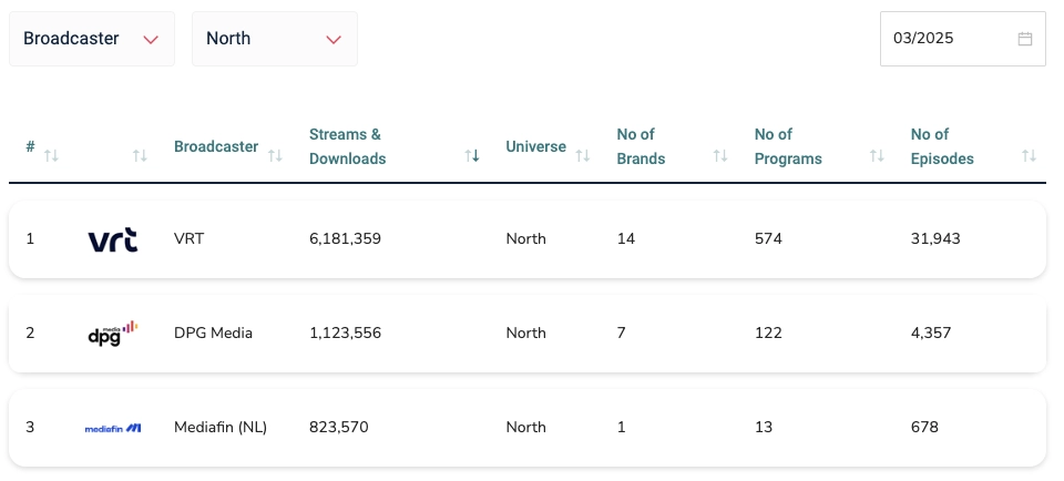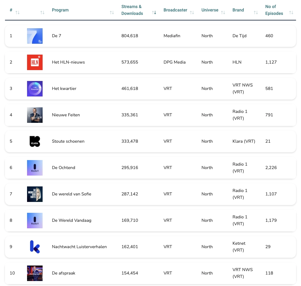 • VRT NWS (VRT), avec 961.505 streams, avec 18 programmes et 5.892 épisodes.