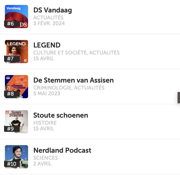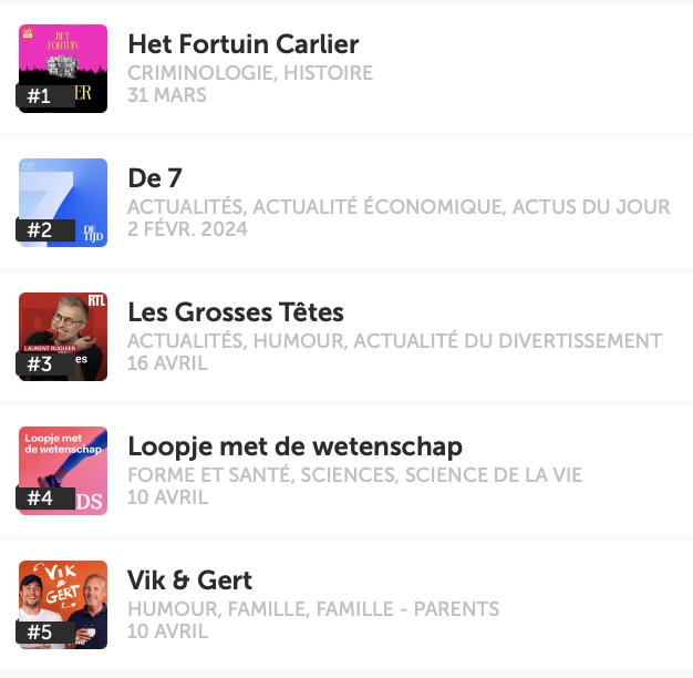 Les 100 podcasts les plus populaires en Belgique