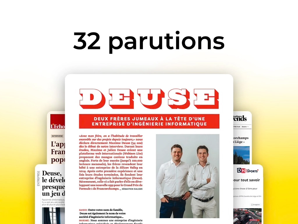 Deuse est une jeune entreprise spécialisée en développement d’outils technologiques sur mesure : applications, plateformes web, sites ou encore logiciels. Basée à Liège, elle a été lancée en 2016 par les jumeaux Maxime et Julien Deuse. La société, composée d’ingénieurs en informatique de pointe, met sa passion au service de projets de petite ou grande envergure, dans un but : donner de l’élan et offrir de la croissance à leurs clients. Après son bureau à Liège, l’entreprise a également ouvert une antenne à Bruxelles et en Flandre !