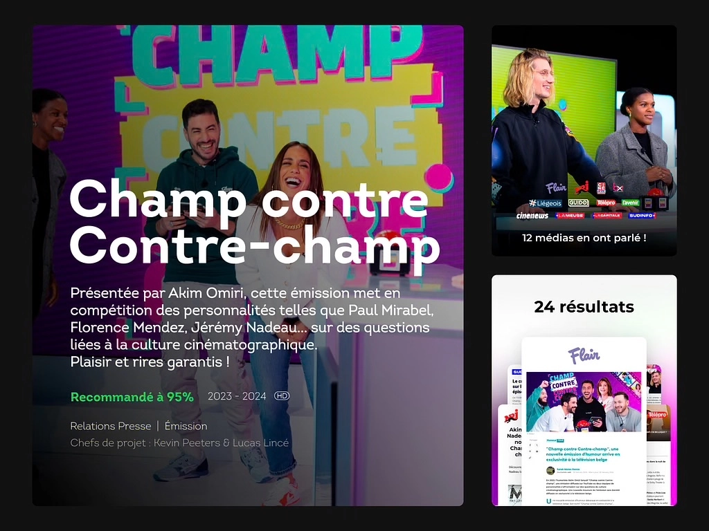 Quelques exemples de campagnes que nous avons menées : Les Oscars, le Festival de Cannes, Fresh Festival, Offline, le Ballon d'Or, .doc, Golden Globes, Champ Contre-Champ. En tout, 53 campagnes, 82 médias différents et près de 700 résultats !