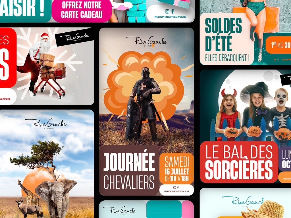 Notre avons d’abord travaillé avec l’équipe de Rive Gauche pour comprendre leur vision et leur public cible. Nous avons ensuite repensé l’identité graphique du centre commercial afin de créer des visuels impactants. Pendant plusieurs mois, notre équipe graphique a travaillé sur la création de visuels sur mesure pour tous les événements organisés par Rive Gauche.