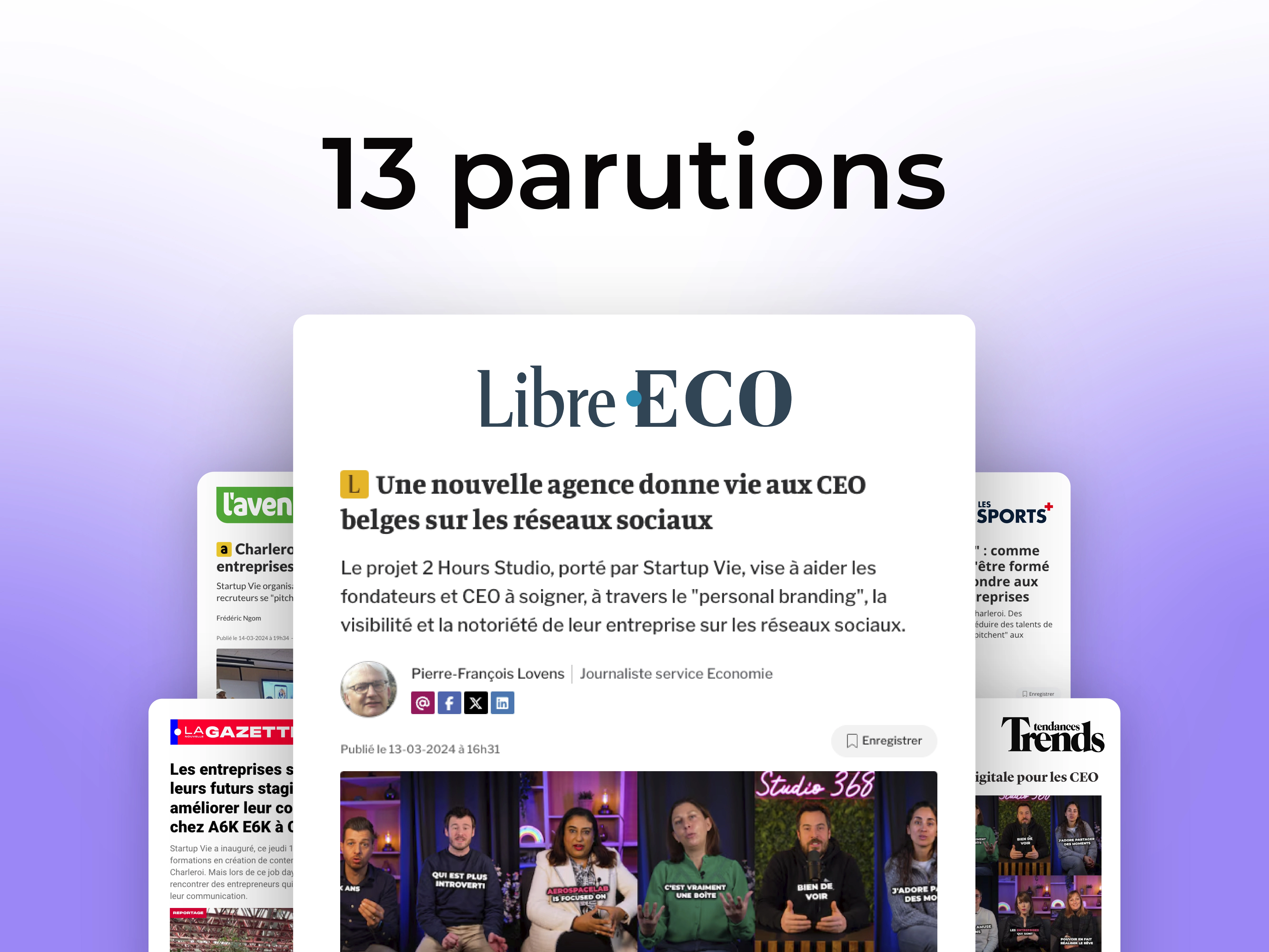 The launch of their new agency, "2 Hours Studio," aimed at developing CEOs' personal branding to increase their visibility, was particularly challenging. The agency was starting from scratch, and we sent out our first press release on the very first day of its launch. In short, everything had to be built ! What we can say is that the media, especially specialized outlets, showed a strong interest in covering the news, starting with PUB, Trends-Tendances, as well as La Libre.