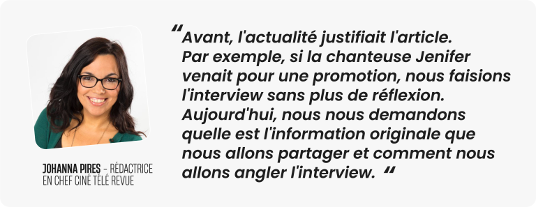 Chez Ciné Télé Revue, nous avons évolué pour nous démarquer de la concurrence, notamment en adoptant des angles originaux et pertinents pour chaque sujet couvert. Avant, l’actualité justifiait l’article. Par exemple, si la chanteuse Jenifer venait pour une promotion, nous faisions l’interview sans plus de réflexion. Aujourd’hui, nous nous demandons quelle est l’information originale que nous allons partager et comment nous allons angler l’interview.