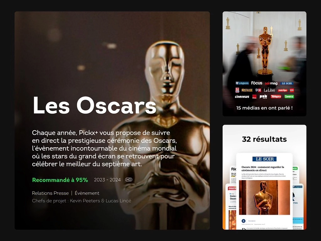 Quelques exemples de campagnes que nous avons menées : Les Oscars, le Festival de Cannes, Fresh Festival, Offline, le Ballon d'Or, .doc, Golden Globes, Champ Contre-Champ. En tout, 53 campagnes, 82 médias différents et près de 700 résultats !